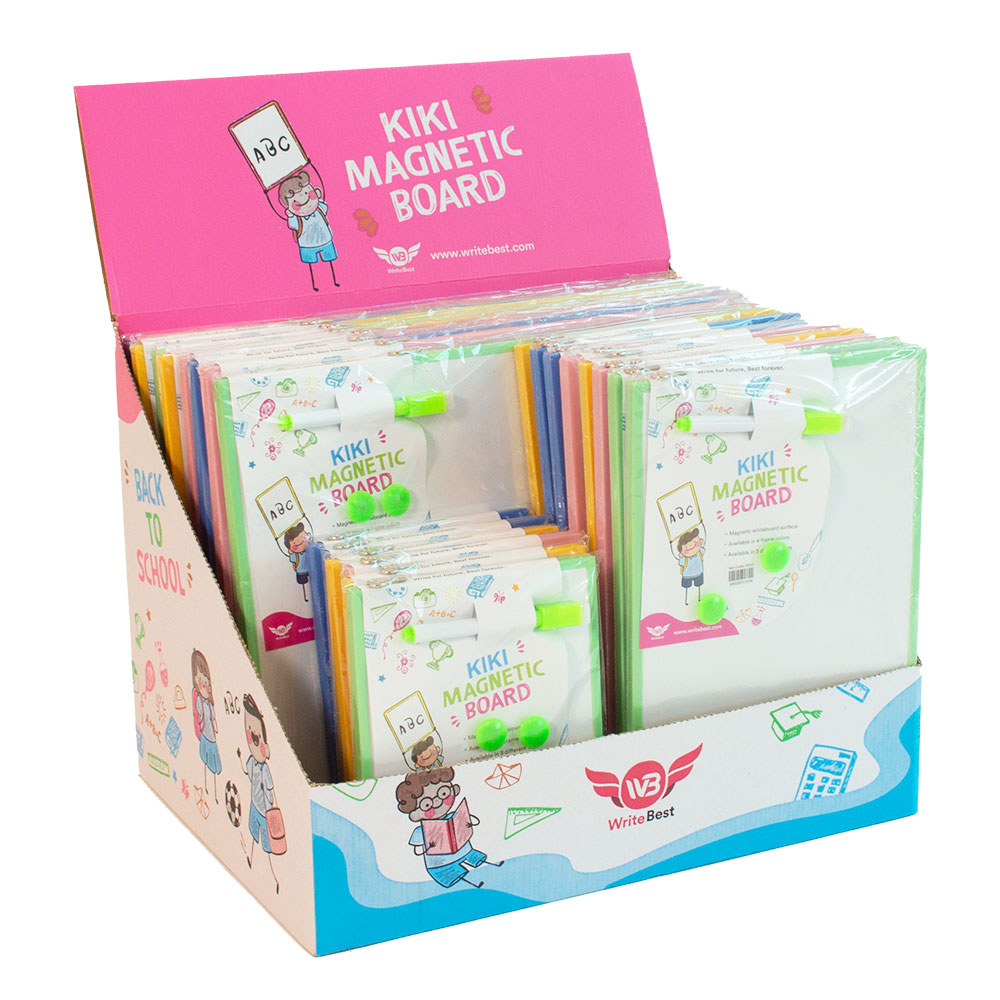 - Kiki Magnetic Board is perfect for children in their journey of creativity and exploration. It comes in a set with a marker and magnetic buttons.
